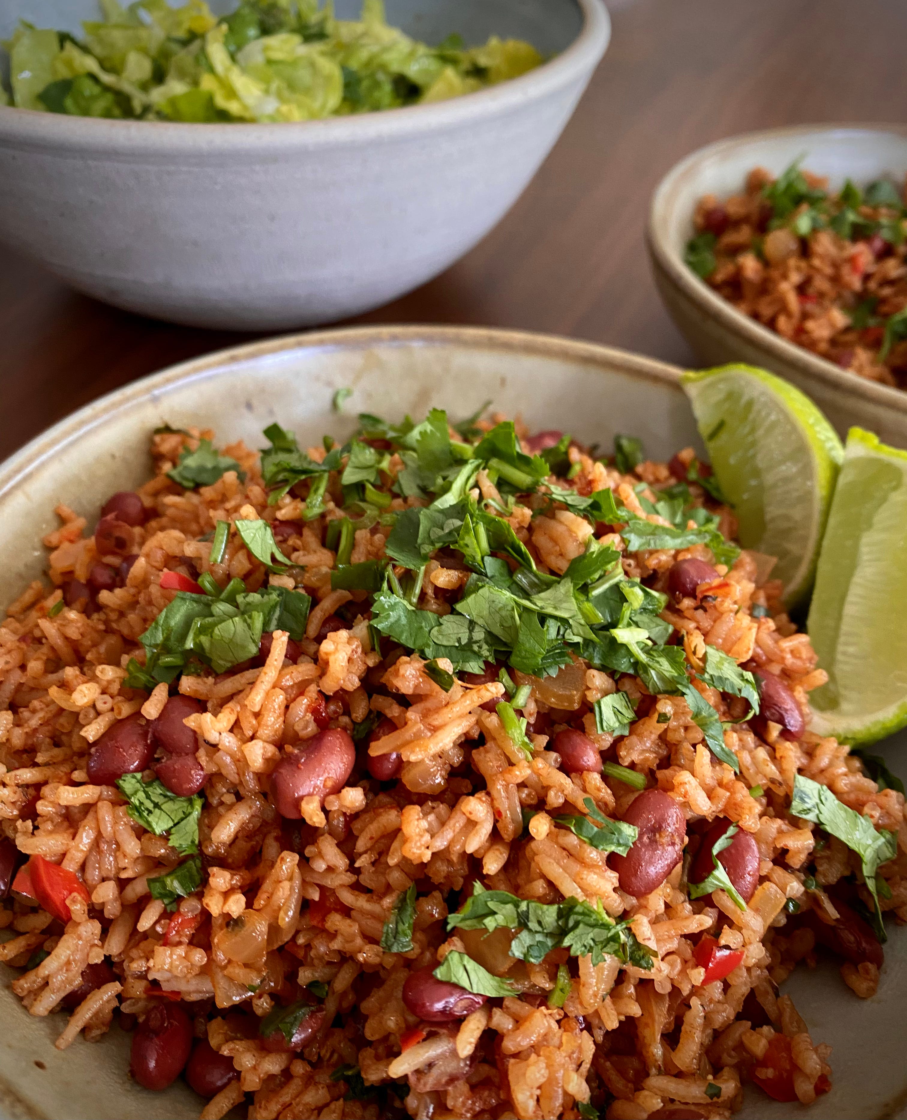 Bring all this to a boil over medium-high heat, cover, and turn down the heat to maintain a gentle, low simmer. Cook until the water is absorbed, and the rice is tender, about 18 minutes. Don’t peek in the pot while this is going on, just set a timer for 15 minutes and only start checking after it goes off. Taste and season with salt and lime juice to get it however you like.