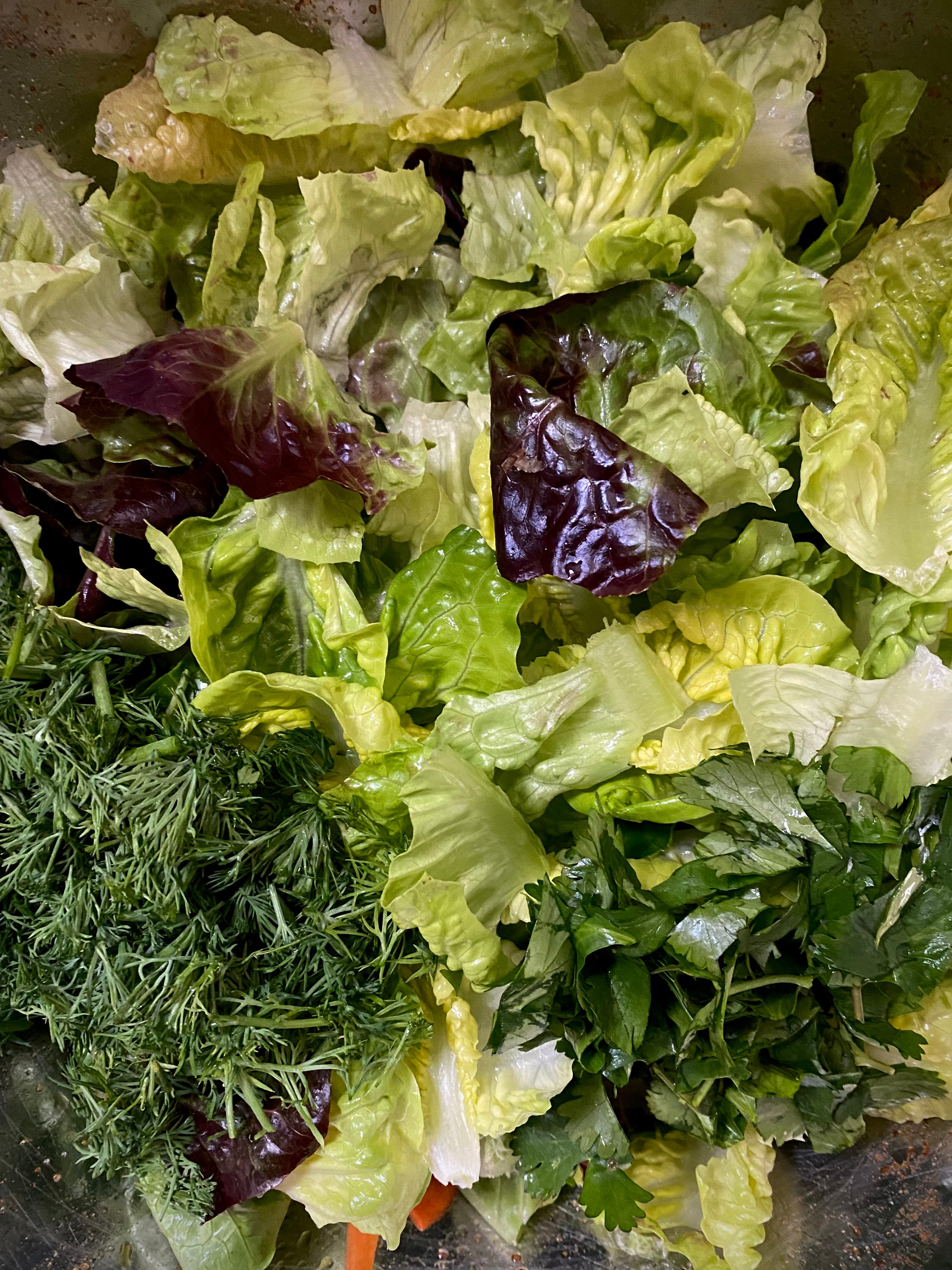 Throw all the lettuce and salad ingredients in a large bowl and stick them in the fridge.