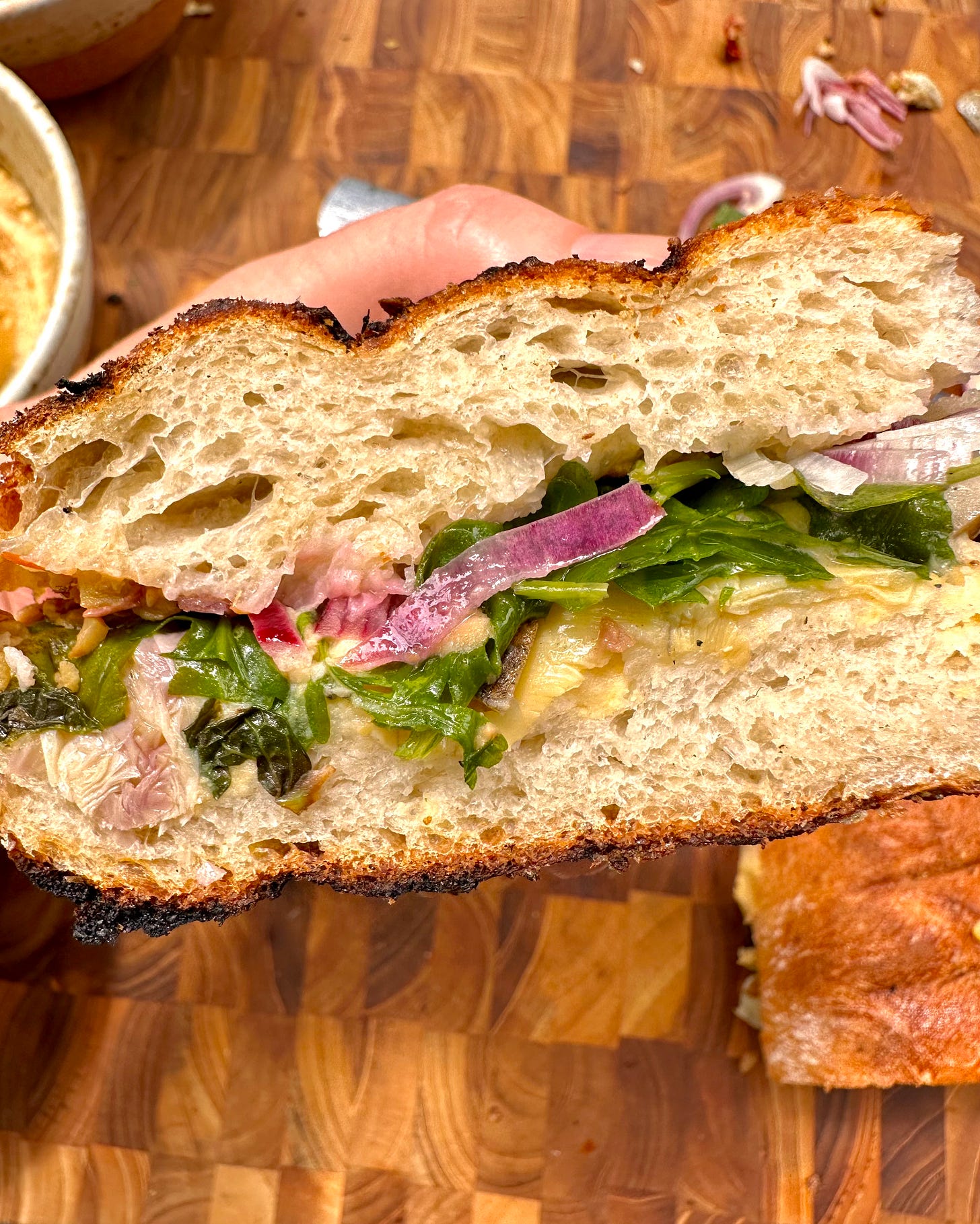 To make this show stopping sammie, you’re gonna need a big, flattish loaf of bread like a ciabatta which will hold up best during grilling. The whole sammie seems much fancier than it actually is when you start cutting off slices to share with the party. People love that shit. Feel free to sub in all kinds of ingredients to make this recipe your own. We like tapenade but you could use pesto instead, or our pickled red onions instead of raw, throw a roasted red pepper into the hummus, or use your favorite store-bought kind. Whatever you do, people are guaranteed to be impressed with your grilled sandwich. Now let’s fire this sucker up!
