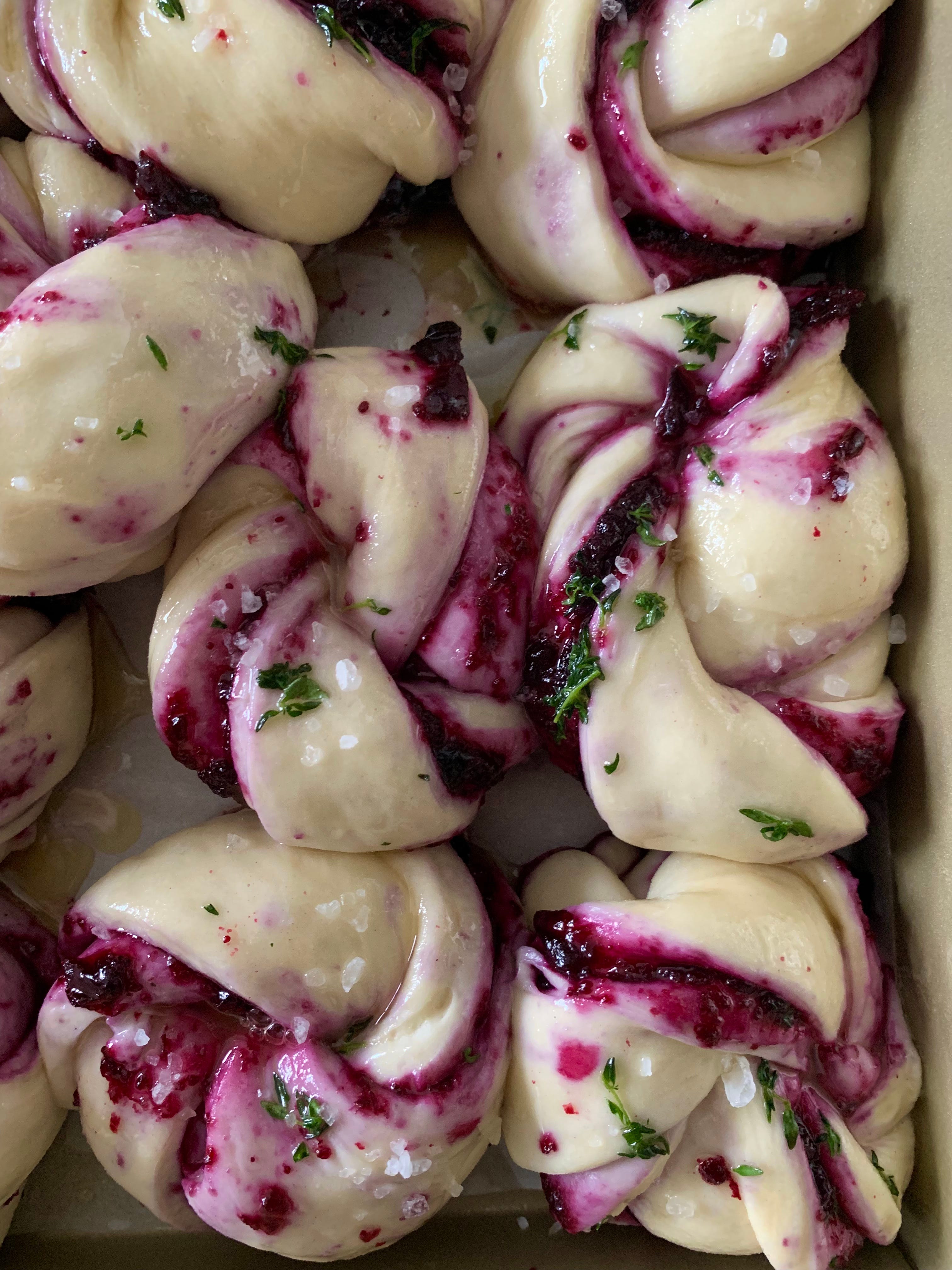 The idea for making a ribbon of savory jam through a roll was born through struggle and many, many mistakes. We were eating entirely too much jam during this part of quarantine, so we had to figure this shit out before we went full Violet Beauregarde.